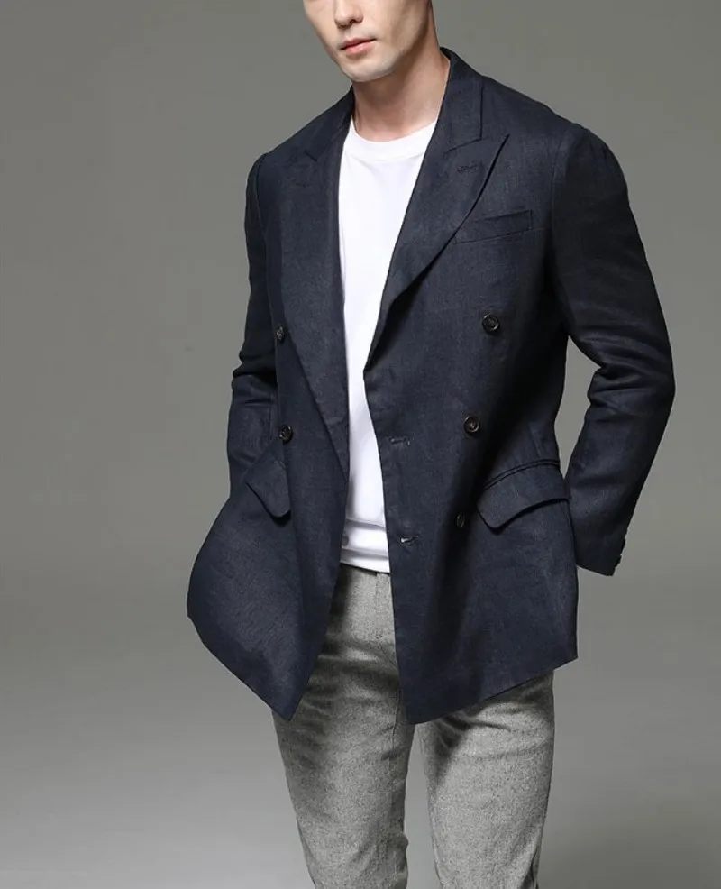 Fashion Summer Men Linen Blazer Suit Coat Blazer Solid Color Jacket Double Breasted Slim Fit Breathable Business Work Casual